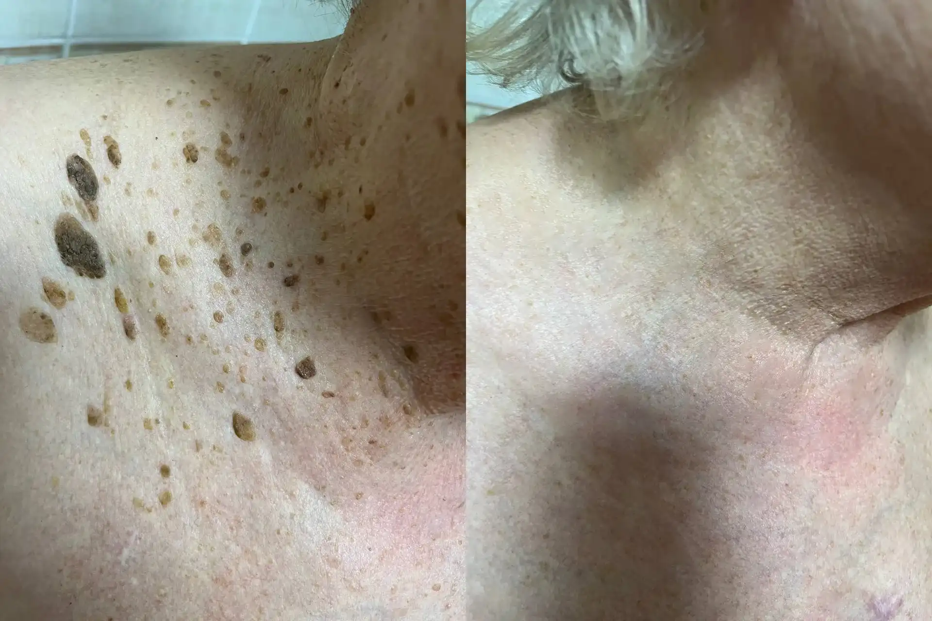 Skin tags (acrochordons) are small, noncancerous growths that tend to be the same color as your skin. They often look like a cluster of skin tissue extending from a tiny stem. They’re sometimes darker and may resemble a raised mole. Most skin tags are between 1-5 mm, but some can grow as large as a few centimeters. Β According to clinical research from the British Association of Dermatology, individuals with warts, moles, and skin tags are more prone to developing actinic keratosis and follicular keratosis.