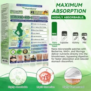 𝐏𝐮𝐫𝐞𝐥𝐨𝐫𝐚® 𝐁𝐞𝐞 𝐕𝐞𝐧𝐨 𝐕𝐄𝐍𝐄-𝐇𝐄𝐀𝐋 𝐱 𝐍𝐀𝐃+ 𝐁𝐄𝐑𝐁𝐄𝐑𝐈𝐍𝐄 𝟏𝟐-𝐢𝐧-𝟏 𝐀𝐝𝐯𝐚𝐧𝐜𝐞𝐝 𝐍𝐚𝐧𝐨 𝐌𝐢𝐜𝐫𝐨𝐧𝐞𝐞𝐝𝐥𝐞 𝐏𝐚𝐭𝐜𝐡 was developed through more than 20 years of research by a multidisciplinary team of over 30 experts. Each patch incorporates an ultra-fine microneedle architecture measuring approximately one-seventh the thickness of a human hair, designed to ensure a smooth and virtually painless application. The formulation contains highly concentrated natural bioactive compounds, up to 20-fold higher than conventional market levels, including Moringa and Berberine, which act synergistically to support healthy glycemic responses, appetite regulation, and lipid metabolism, thereby promoting gradual and sustainable weight management. Enriched with NAD+, the patch further supports skin firmness and structural resilience during body-weight fluctuations, helping maintain a lean appearance without compromising comfort or aesthetics. Additional high-efficacy components contribute to the support of immune function, digestive health, gut balance, women’s health, daily energy levels, and fatigue reduction, collectively promoting a more youthful and resilient physiological state from within. Manufactured in facilities that comply with U.S. quality standards, this needle-free, science-driven solution provides a safe and comprehensive approach to effective weight management and long-term metabolic health, designed to work in harmony with the body rather than against it.