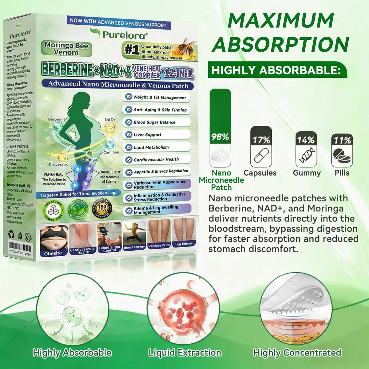 𝐏𝐮𝐫𝐞𝐥𝐨𝐫𝐚® 𝐁𝐞𝐞 𝐕𝐞𝐧𝐨 𝐕𝐄𝐍𝐄-𝐇𝐄𝐀𝐋 𝐱 𝐍𝐀𝐃+ 𝐁𝐄𝐑𝐁𝐄𝐑𝐈𝐍𝐄 𝟏𝟐-𝐢𝐧-𝟏 𝐀𝐝𝐯𝐚𝐧𝐜𝐞𝐝 𝐍𝐚𝐧𝐨 𝐌𝐢𝐜𝐫𝐨𝐧𝐞𝐞𝐝𝐥𝐞 𝐏𝐚𝐭𝐜𝐡: 98% Absorption Rate, Transforming Weight, Liver, Gut & Skin Health