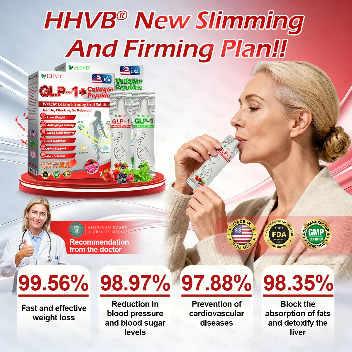 HHVBยฎGLP-1+Collagen Peptidesย Weight Loss&Firming Oral Solution Developed by an international team of metabolic and endocrinology experts, the GLP-1 + Collagen Peptides Oral Solution represents a groundbreaking synergy in weight management and skin regeneration.GLP-1 technology precisely targets the bodyโs metabolic center to regulate appetite, accelerate fat breakdown, and restore energy balance. Meanwhile, Collagen Peptides work deep within the dermis to repair structural loss caused by fat reduction, rebuilding the skinโs support network and visibly improving firmness and elasticity.Clinical studies demonstrate that this dual-action formula delivers measurable resultsโreducing body fat while enhancing skin tightness within a short period of use. It offers a scientifically validated solution for sustainable health, firmness, and long-lasting vitality.