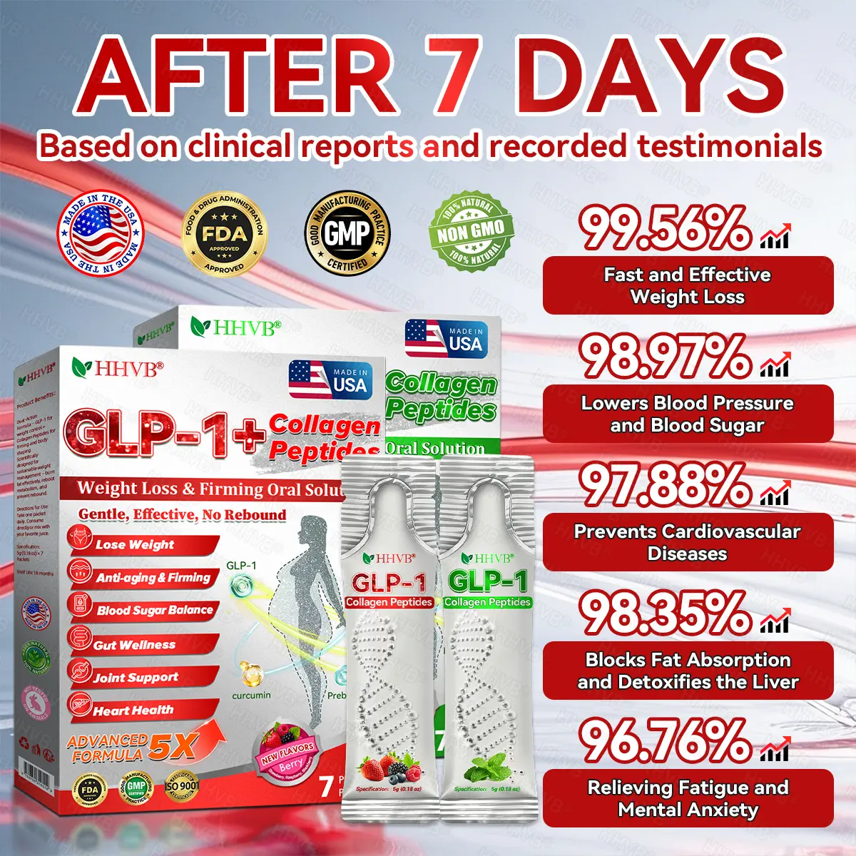 Clinically validated by endocrinologists, HHVBยฎ GLP-1 + Collagen Peptides Oral Solution delivers visible improvements in obesity, skin firmness, and overall health within just 7 days.
