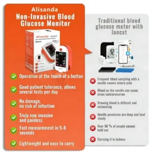 The Alisanda™ Non-Invasive 4-in-1 Advanced Glucose Monitor lets you say goodbye to painful fingertip blood tests, offering up to 99.9% accuracy for easy, safe, and painless glucose monitoring. It uses photon chip technology and ‘light absorption spectroscopy’ to provide precise readings. Bluetooth connectivity delivers real-time results, and its non-invasive design ensures simplicity and cost-effectiveness.