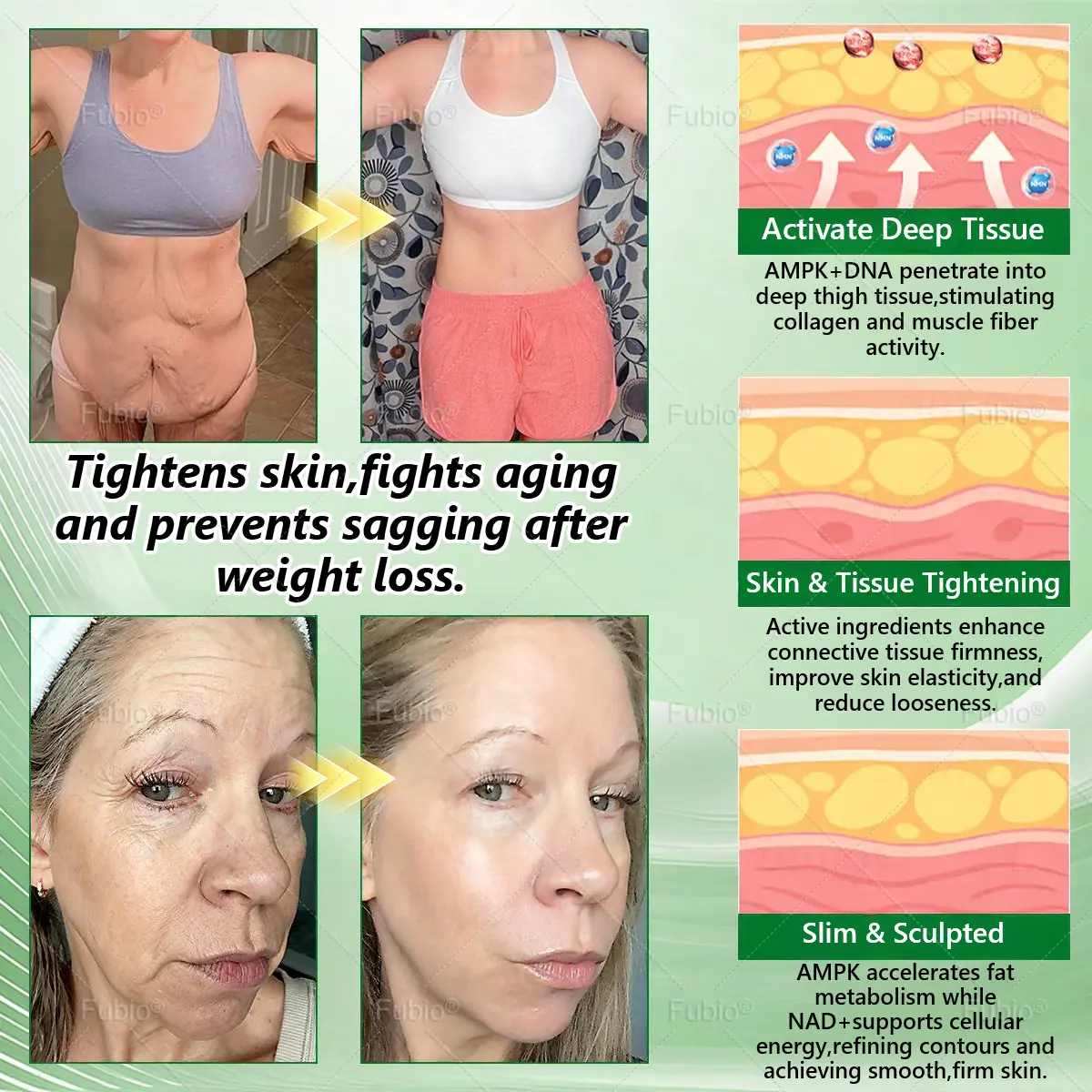Benefits:ย Restores skin elasticity, reduces fine lines, prevents skin sagging after weight loss