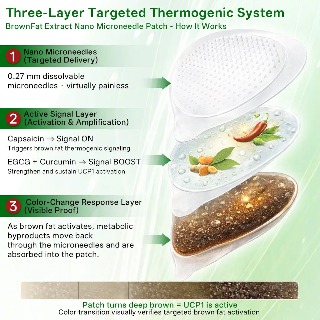 Ultra-fine nano microneedles deliver active compounds directly to skin-adjacent brown fat tissue, bypassing digestive loss and systemic overload. Once delivered, capsaicin initiates thermogenic signaling, while EGCG and curcumin amplify and stabilize UCP1 activity, supporting sustained non-shivering thermogenesis and efficient energy dissipation. As brown fat enters an active metabolic state, characteristic heat and lipid-associated byproducts are released and absorbed into the patchโs color-responsive matrix, triggering a visible transition from transparent to brown.
