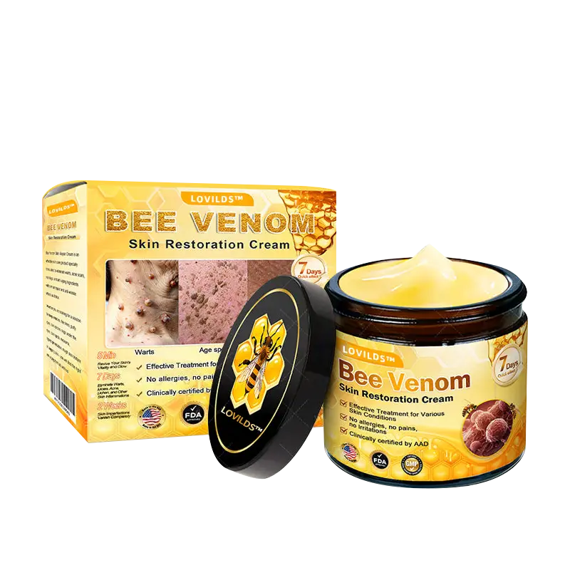 The creation of LOVILDS™ 𝘽𝙀𝙀 𝙑𝙀𝙉𝙊𝙈 Skin Restoration Cream stems from the factors of collagen loss and hormonal imbalance, which contribute to skin concerns like wrinkles, aging, sagging, and fat accumulation. By incorporating this product into your routine, you can effectively address issues such as stretch marks, wrinkles, and sagging skin, while enhancing the appearance of your abs, breasts, and buttocks. Moreover, it aids in tightening loose skin and offers various other advantages. Rest assured, LOVILDS™ 𝘽𝙀𝙀 𝙑𝙀𝙉𝙊𝙈 Restoration Cream is crafted from 100% natural ingredients, ensuring both the safety of your skin and the provision of a high-quality product.