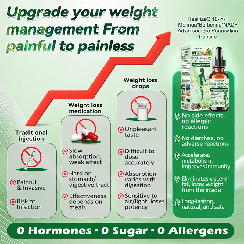 In clinical studies, users who applied Healrize® 10-IN-1 Moringa * Berberine * NAD+ Drops achieved breakthrough results — some losing 6–8 pounds of stubborn fat in just one week. With one daily dose, it targets the most persistent visceral and abdominal fat, helping sculpt a slimmer physique without grueling high‑intensity workouts. This isn’t just weight loss — it’s precision fat reduction that reshapes your body from the inside out. The data speaks for itself: real users, real results, no extreme dieting required.