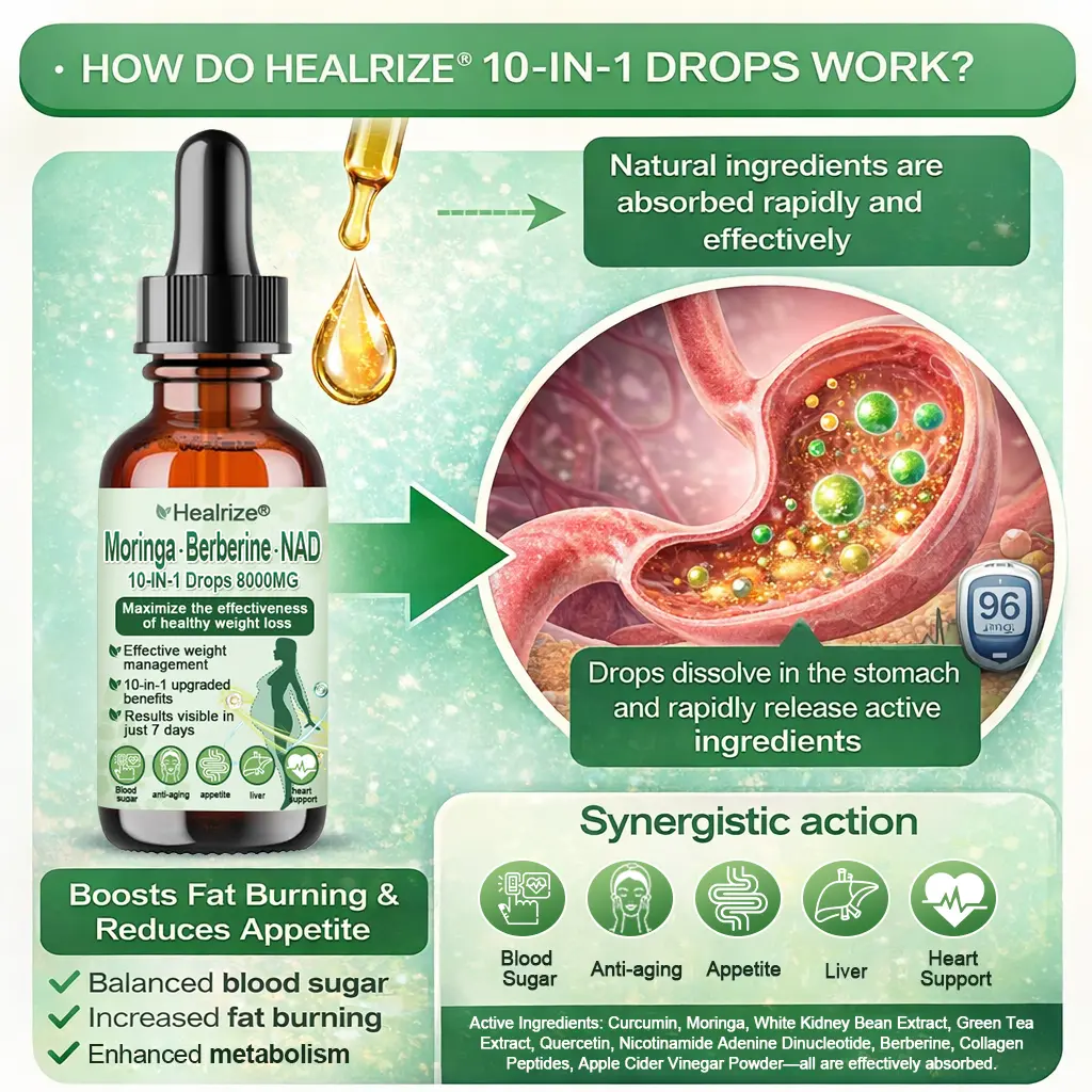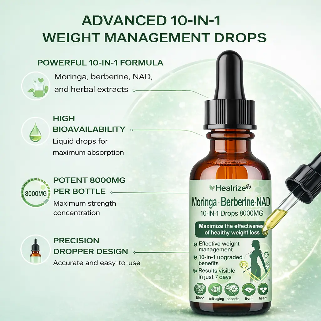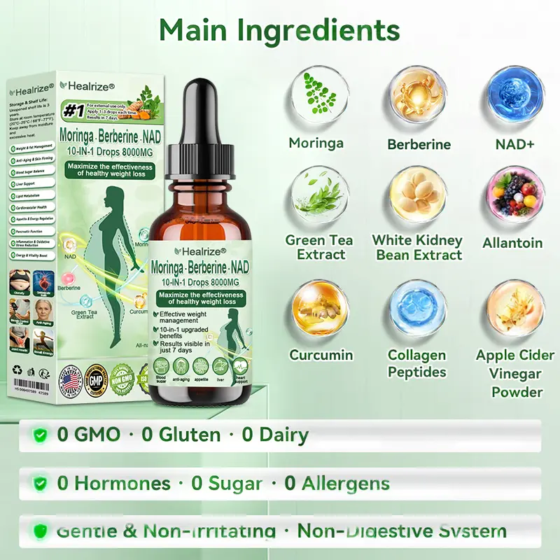 Healrize® 10-IN-1 Moringa * Berberine * NAD+ drops was developed through more than 20 years of research by a multidisciplinary team of over 30 experts. The formulation contains highly concentrated natural bioactive compounds, up to 20-fold higher than conventional market levels, including Moringa and Berberine, which act synergistically to support healthy glycemic responses, appetite regulation, and lipid metabolism, thereby promoting gradual and sustainable weight management. Enriched with NAD+, the drops further supports skin firmness and structural resilience during body-weight fluctuations, helping maintain a lean appearance without compromising comfort or aesthetics. Additional high-efficacy components contribute to the support of immune function, digestive health, gut balance, women’s health, daily energy levels, and fatigue reduction, collectively promoting a more youthful and resilient physiological state from within. Manufactured in GMP-certified facilities that comply with both United States and EU quality standards, this needle-free, science-driven solution provides a safe and comprehensive approach to effective weight management and long-term metabolic health, designed to work in harmony with the body rather than against it.