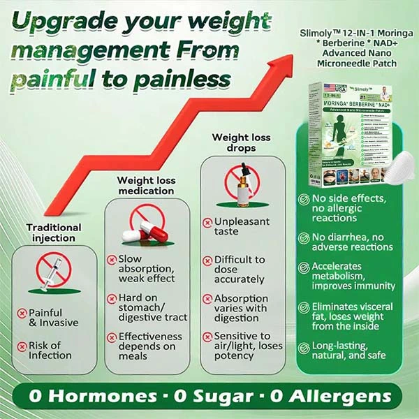 Clinically tested by endocrinology experts, the Slimoly™ 12-IN-1 Moringa * Berberine * NAD+ Advanced Nano Microneedle Patch features a brand-new, natural formula with triple-strength upgrades.Clinically noticeable improvements in 7 days — no rebound effect.