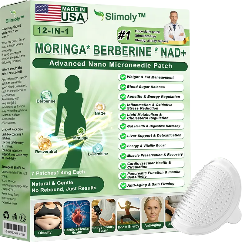Slimoly™ 12-IN-1 Moringa * Berberine * NAD+ Advanced Nano Microneedle Patch was developed through more than 20 years of research by a multidisciplinary team of over 30 experts. Each patch incorporates an ultra-fine microneedle architecture measuring approximately one-seventh the thickness of a human hair, designed to ensure a smooth and virtually painless application. The formulation contains highly concentrated natural bioactive compounds, up to 20-fold higher than conventional market levels, including Moringa and Berberine, which act synergistically to support healthy glycemic responses, appetite regulation, and lipid metabolism, thereby promoting gradual and sustainable weight management. Enriched with NAD+, the patch further supports skin firmness and structural resilience during body-weight fluctuations, helping maintain a lean appearance without compromising comfort or aesthetics. Additional high-efficacy components contribute to the support of immune function, digestive health, gut balance, women’s health, daily energy levels, and fatigue reduction, collectively promoting a more youthful and resilient physiological state from within. Manufactured in GMP-certified facilities that comply with both United States and EU quality standards, this needle-free, science-driven solution provides a safe and comprehensive approach to effective weight management and long-term metabolic health, designed to work in harmony with the body rather than against it.