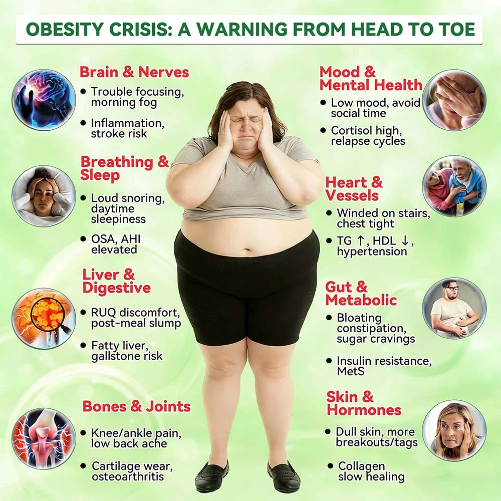 Can address multiple obesity-related complications, such as cardiovascular disease, type 2 diabetes, arthritis, high obesity/hypertension, fatty liver, liver function recovery, brain fog and memory decline, as well as women’s health issues including hormonal imbalances, menopause-related symptoms, and vaginal problems such as itching and odor.
