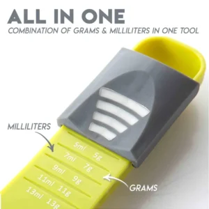 Comes with 8 measuring spoon sizes in one spoon. Combination of grams and milliliters in one tool.