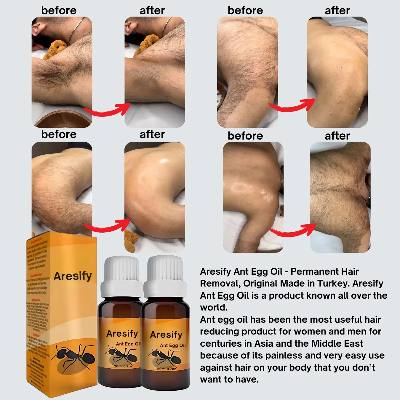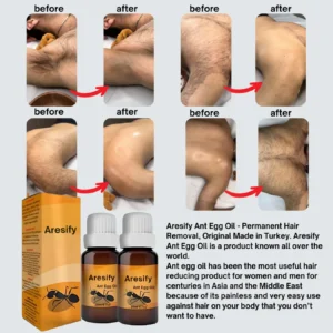 To ensure the product’s safety and non-irritating nature, conducting a patch test before the first use is highly recommended. This step ensures that the oil is suitable for your skin, allowing it to glow with health and boost your self-assurance. The balanced composition not only focuses on hair inhibition but also supports overall skin vitality, making it an all-encompassing care solution. Aresify® ANT EGG OIL is crafted to deliver noticeable improvements while maintaining the skin’s natural harmony. Experience the transformation towards radiant, healthy skin and enhanced confidence with Aresify® ANT EGG OIL.