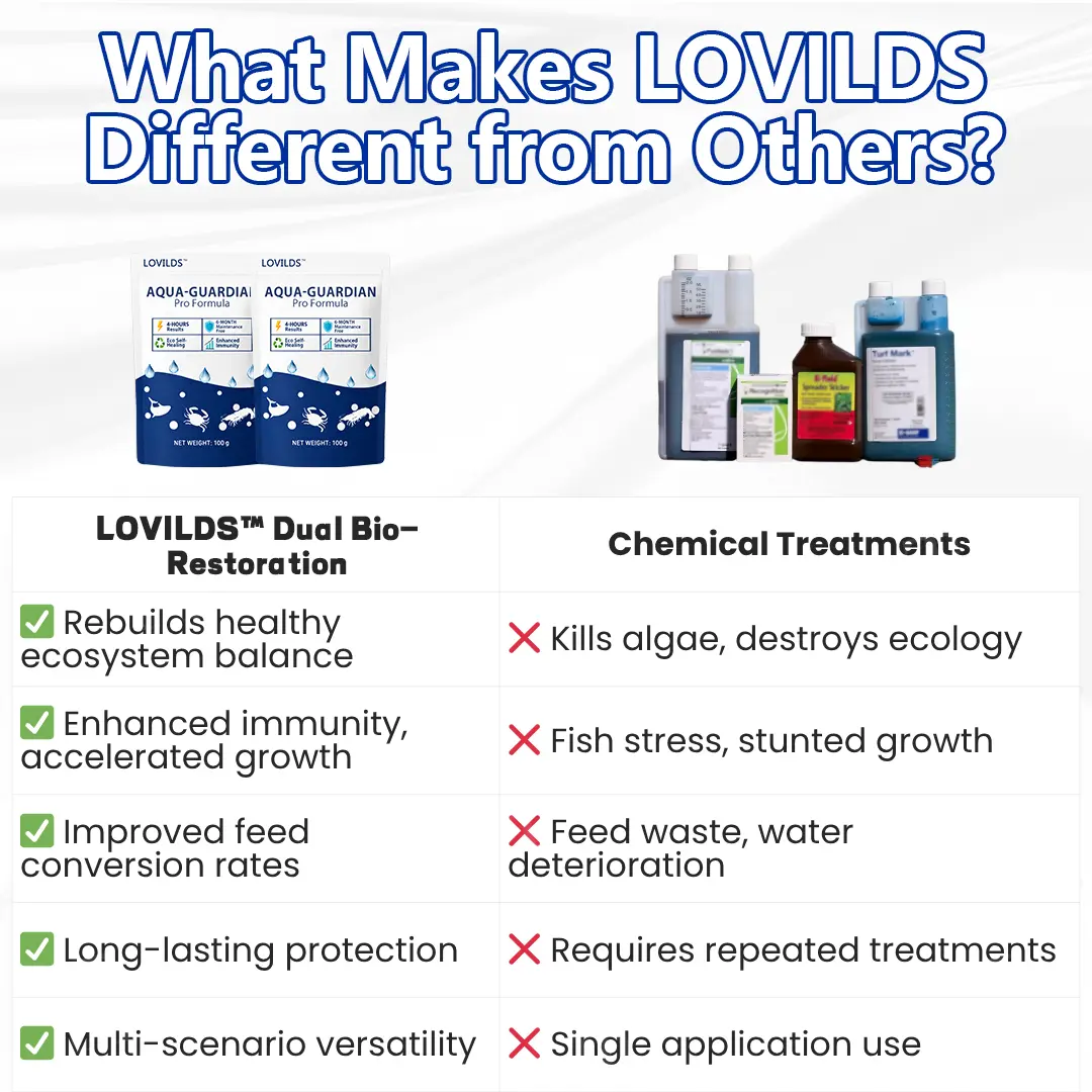 A: Most biological products use single-strain bacteria or enzymes that work slowly and inconsistently. LOVILDS® is the first to successfully combine lactic acid bacteria with postbiotics in a stable formula. This dual mechanism attacks algae problems from two different angles simultaneously, making it impossible for algae to develop resistance.