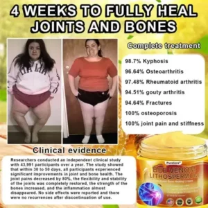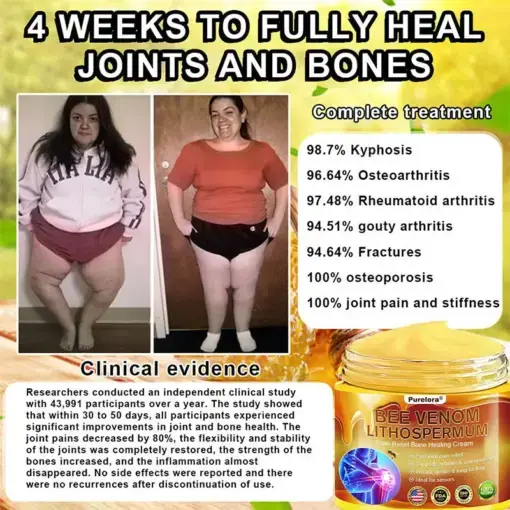 “For years, I struggled with constant knee pain and swelling—my friends used to joke that my knees looked like footballs. When I came across Purelora BEE VENOM LITHOSPERMUM Pain-Relief Bone Healing Cream, I thought I’d give it a go, and it turned out to be the best decision! In less than three weeks, I noticed an incredible improvement—my knee pain eased significantly, and the swelling completely disappeared. Now, I feel like I’ve fully recovered, and this cream has truly made a difference in my life. I’m so grateful for it!”– Isabella Walker