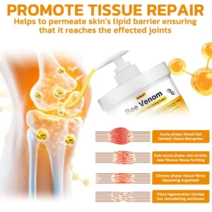 • Bee venom contains enzymes, amino acids, sugars, lipids, and vitamins, which contribute to joint tissue repair and improve mobility.