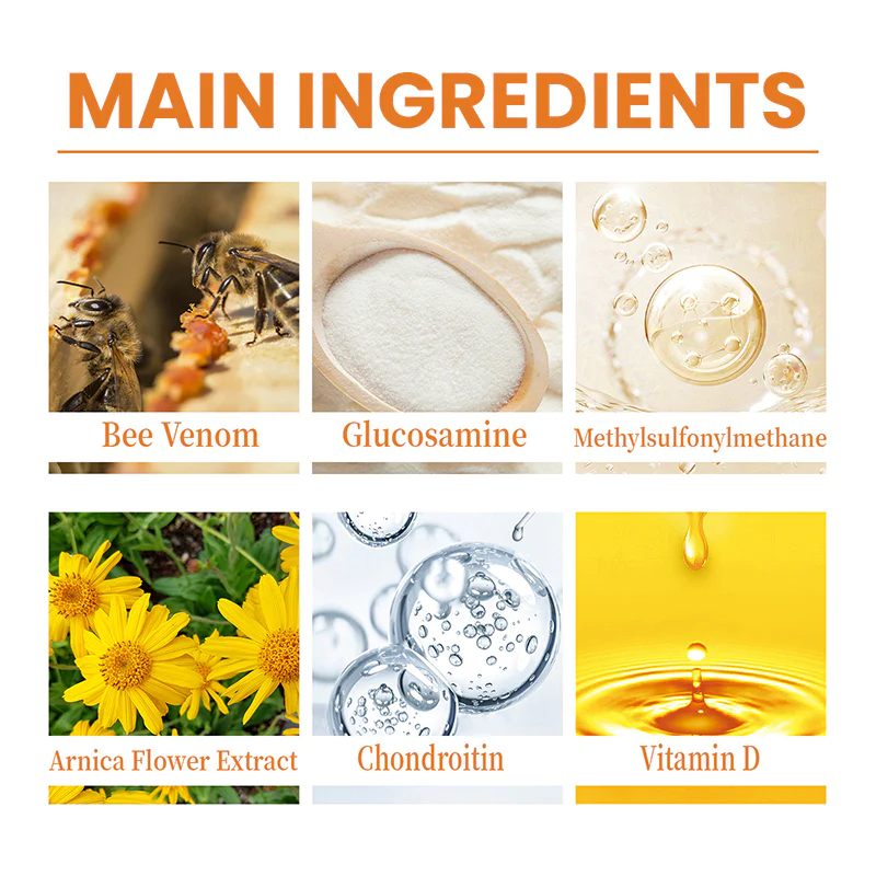 - Key Ingredients: Bee Venom, Glucosamine, Chondroitin, Vitamin D, MSM, Arnica Flower Extract