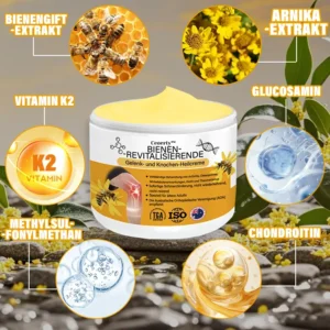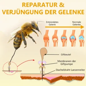 Zusätzlich enthält Bienengift wertvolle Enzyme und Aminosäuren, die zur Reparatur des Gelenkgewebes und zur Verbesserung der Mobilität beitragen.💧🦵🍃