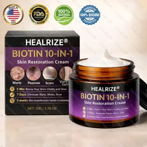 Healrize® Biotin 10-in-1 Skin Restoration Cream combines Biotin with a high-performance skincare complex to help refresh and repair the look of skin. It supports elasticity, improves the appearance of fine lines, and enhances the look of texture and tone. Designed to be up to 20× more concentrated than traditional skincare (based on formula potency), it delivers hydration and helps support collagen for firmer-looking skin. Produced to U.S. and EU quality standards for safe, non-invasive daily use.