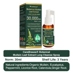 The CareBreeze® Botanical Mullein Leaf Extract Lung Cleanse Spray is recommended by leading lung experts and is designed to thoroughly eliminate lung mucus and repair damaged lung tissue, effectively alleviating various respiratory conditions such as chronic obstructive pulmonary disease (COPD), asthma, and chronic cough.