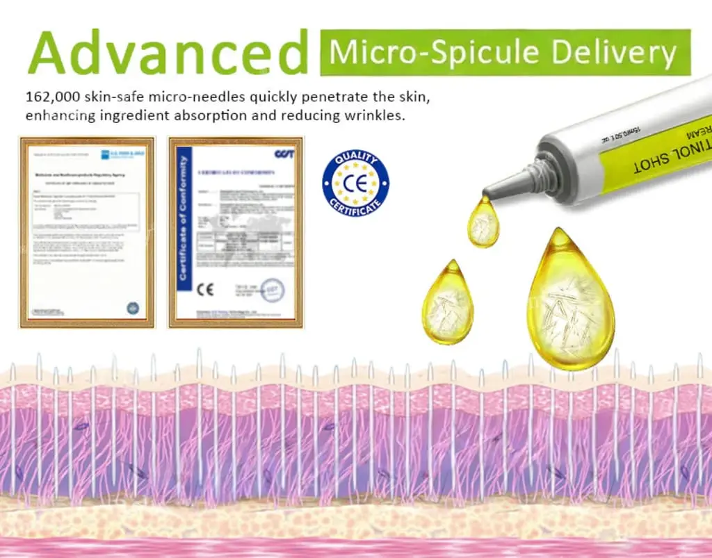 162,000 skin-safe micro-spicules per bottle, each just 1/16th the size of a pore, deliver active ingredients deep into the skin for faster, longer-lasting wrinkle lifting and firming. Clinically tested and manufactured in the USA in a GMP-certified facility, fully compliant with FDA standards and U.S. Cosmetic Safety Regulations.