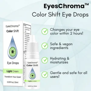 Discover the magic of color with EyesChroma™ Color Shift Eye Drops – a game-changer in the world of eye care. These drops are designed to interact with your unique eye tone, creating a mesmerizing color shift that not only enhances your eyes but also makes the application process more engaging. The high-quality, hypoallergenic formula ensures that these drops are safe for everyone, whether you wear contacts or simply want to brighten your gaze. EyesChroma™ brings a new level of personalization and fun to your eye care routine, making every day a little more vibrant.