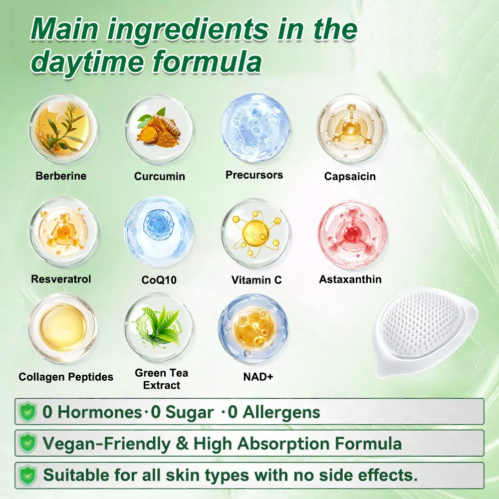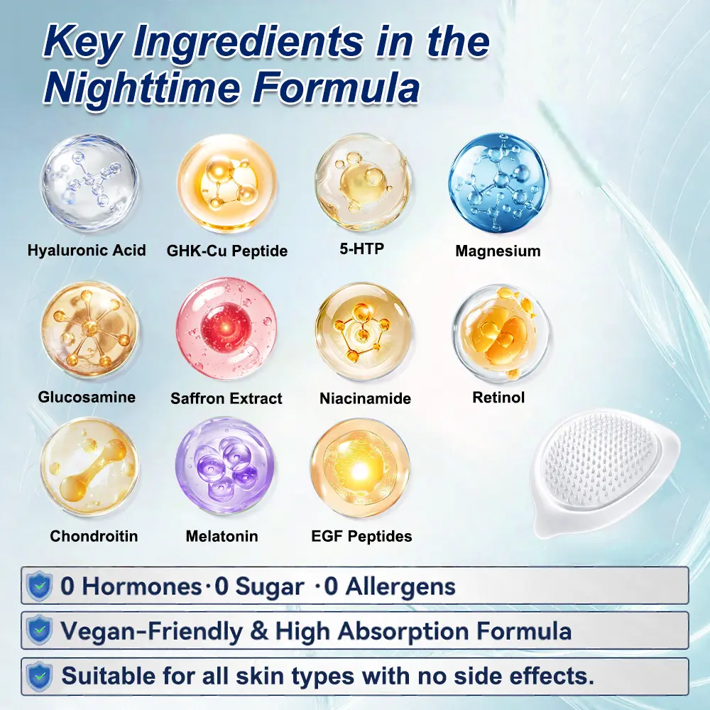 By night — it focuses on repair and renewal, supporting deeper recovery, improved skin firmness, and reduced appearance of wrinkles, while helping rebalance sleep and overall condition. So you don’t just change how your body looks — you improve how it feels, becoming more rested, more balanced, and more confident every day.