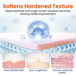 Targets scar tissue and uneven collagen to soften texture, reduce roughness, and help marks blend with surrounding skin over weeks of daily use.