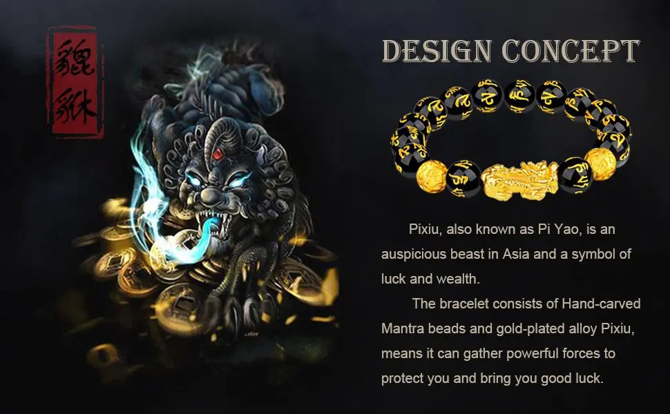 The Obsidian stones and traditional Pi Xiu talisman are believed to bring good fortune, protection from bad luck and attract wealth. It is a symbol to protect lucky, wealth, good fortune and happiness will company with you. It is believed to bring fortune, good tidings and protection to his owner.