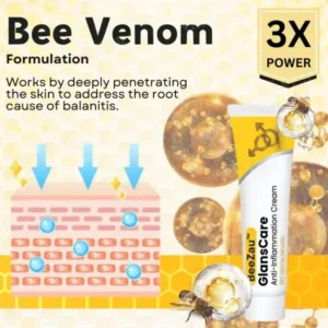 BeeZau™ GlansCare Anti-Inflammation Cream combines the natural healing power of bee venom with a blend of soothing botanicals to provide effective relief for balanitis. The cream’s primary active ingredient, bee venom, contains bioactive compounds like melittin and phospholipase A2, which have potent anti-inflammatory, antimicrobial, and pain-relieving properties. These compounds work synergistically to reduce swelling, redness, and irritation in the affected area, while also targeting harmful bacteria and fungi that contribute to the condition. By addressing the root causes of balanitis, BeeZau™ provides immediate relief and supports the body’s natural healing process, helping to restore the skin to its optimal condition.