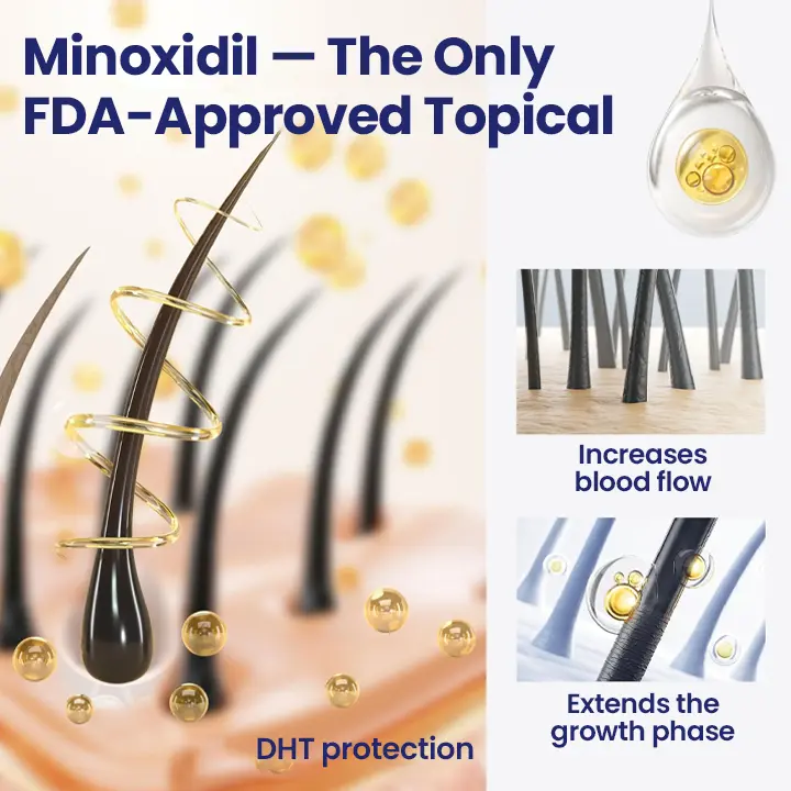 Minoxidil is the ONLY FDA-approved topical ingredient clinically proven to regrow hair. Our maximum strength 5% formula delivers: