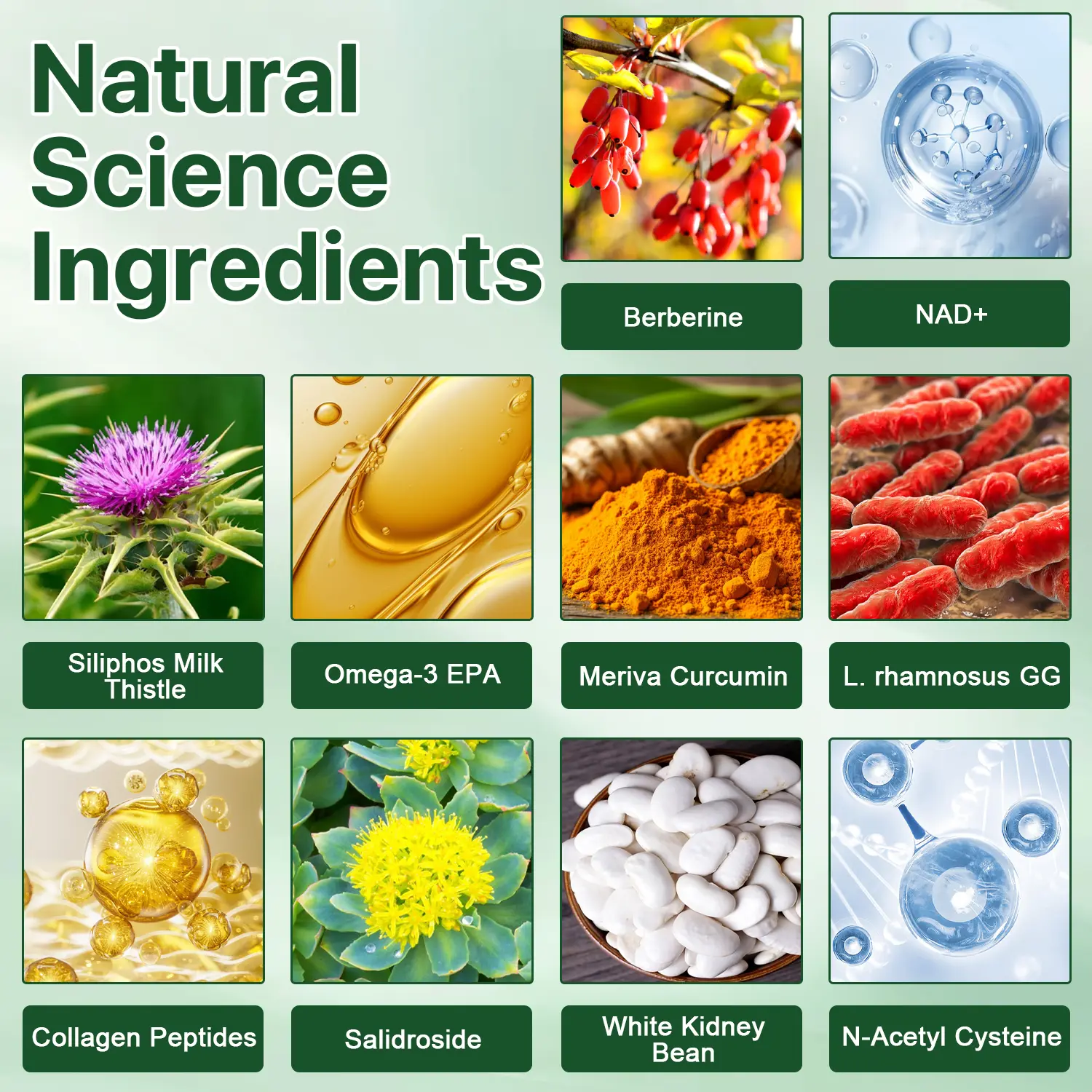 Curcumin enhances the activity of Phase I and Phase II hepatic detoxification enzymes, accelerates fatty acid oxidation, and increases mitochondrial energy output. Berberine further improves hepatic detoxification efficiency, significantly reduces lipid accumulation, and stabilizes mitochondrial function. Together, this synergistic interaction promotes more robust metabolic cleansing capacity, lowers inflammatory activity, and helps maintain a healthier liver state.