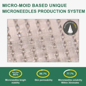 Each needle is 0.27mm long. just 1/7th the thickness of a hair. and is made from dissolvable medication. These micro-needles are precision-engineered using cutting-edge manufacturing techniques to ensure a seamless. pain-free experience while effectively delivering the active ingredients directly into the skin.