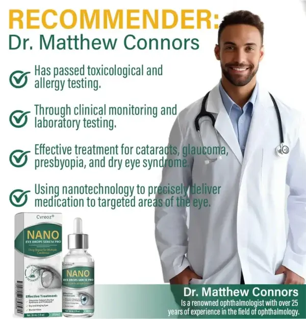“A few years ago, I was diagnosed with early-stage cataracts. At first, my vision was just a bit blurry, but things got worse over time. I started having trouble reading, cooking, and even going outside on bright sunny days—everything just felt way too dazzling and uncomfortable. Then one day, I came across Cvreoz® Nano Eye Drops Serum Pro online and thought, why not give it a try? To my surprise, after sticking with it for a few weeks, I genuinely started noticing an improvement. I stopped waking up with that foggy feeling, and my eyes didn’t feel nearly as tired during the day.