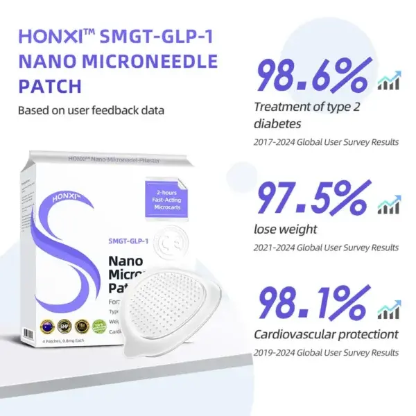 The HonXi™ SMGT-GLP-1 Nano Microneedle Patch offers a long-lasting, slow release of the medication, ensuring a stable effect over 24 hours without causing any discomfort. With the same dosage and price, it can maintain up to 20 times longer-lasting effects (similar to the difference between an IV drip and a single injection).