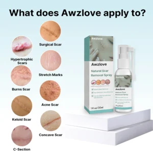 Awzlove™ Natural Scar Removal Spray– Made with allantoin and advanced scar Serum, our formula helps promote skin health, firmness, and elasticity to reduce the appearance of most types of scars, including surgical scars, burn scars, hypertrophic scars, and keloids. The silicone-based scar Gel forms a breathable layer to increase the skin hydration, protect the scar tissue, normalize the collagen synthesis and balance the skin growth procedure,which can make your skin look smooth and even!
