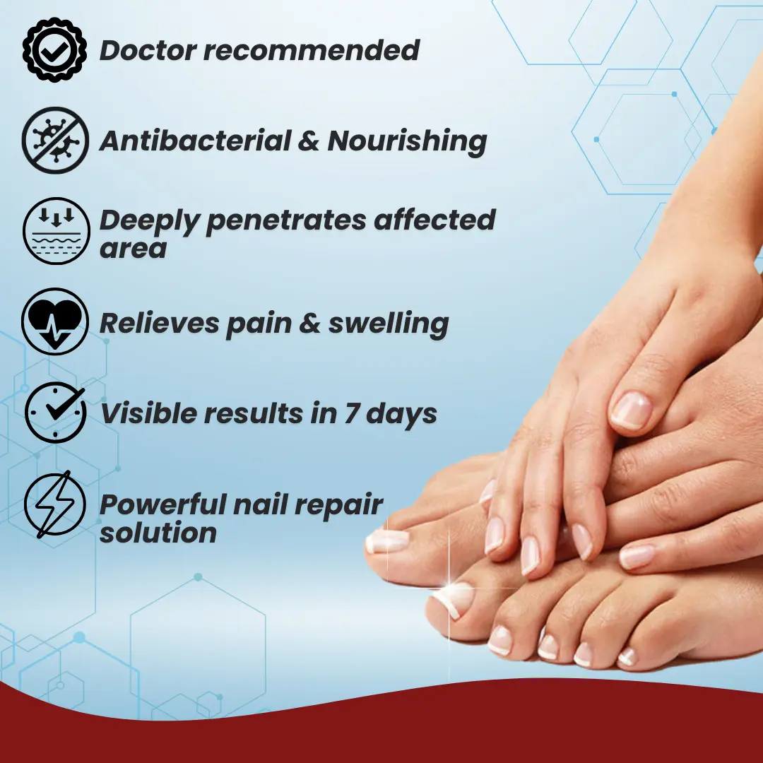 Furthermore, it supports the rejuvenation of healthy nails, gently removing damaged layers and restoring your nails to their original, healthy state while addressing various levels of nail fungus. This process also facilitates the regrowth of new, healthy nails, leaving them smooth and lustrous. Its formula contains 100% safe and natural ingredients, that are clinically recognized for their ability to target fungal cells’ unique processes and structures, effectively eradicating fungal growth and preventing its recurrence.