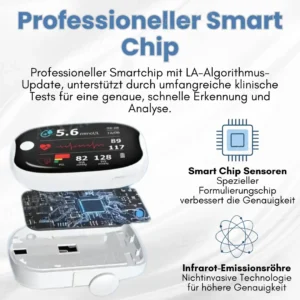 Zusätzlich zu seinem nicht-invasiven Design verfügt Glycenx™ über fortschrittliche Smart-Chip-Sensoren, die die Genauigkeit jedes Messwerts verbessern. Diese Sensoren wurden speziell entwickelt, um die Präzision des Geräts zu verbessern und sicherzustellen, dass Sie äußerst zuverlässige Glukosespiegelmessungen erhalten. Der Smart-Chip arbeitet nahtlos mit der Infrarot-Technologie zusammen, so dass das Gerät schnell und effizient Echtzeitdaten über Ihren Blutzuckerspiegel liefern kann. Das Ergebnis ist eine zuverlässige Überwachungslösung, die die Genauigkeit bietet, die Sie benötigen, um Ihren Glukosespiegel effektiv zu überwachen, und gleichzeitig den Prozess zugänglicher und schmerzfreier macht.