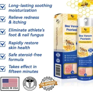 LOVILDS™ PsoriaHeal Bee Venom Psoriasis Treatment Spray cleanses the skin from the inside out, effectively alleviating itching and inflammation without using harsh chemicals. It minimizes the abnormal growth of skin cells triggered by psoriasis, providing relief from inflammation, itching, and scaling often associated with this condition.
