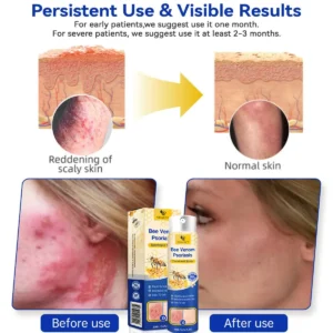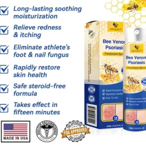 LOVILDS™ PsoriaHeal Bee Venom Psoriasis Treatment Spray detoxifies the skin from within, easing itching and inflammation. It is free from irritating chemicals and does not aggravate already damaged skin. LOVILDS™ effectively controls the proliferation of skin cells caused by psoriasis, offering relief from the inflammation, itching, and scaling associated with this condition.