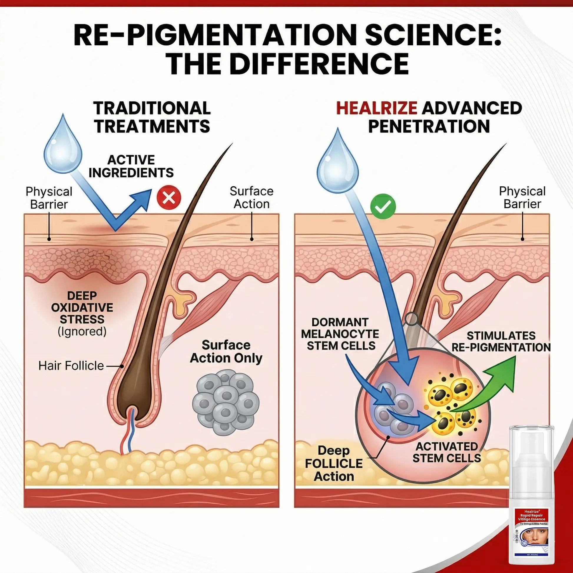 Traditional treatments only address surface inflammation. They ignore the deep “oxidative stress” and the impenetrable physical barrier of your skin. If active ingredients cannot reach the hair follicle bulge where dormant melanocyte stem cells reside, repigmentation is biologically impossible.