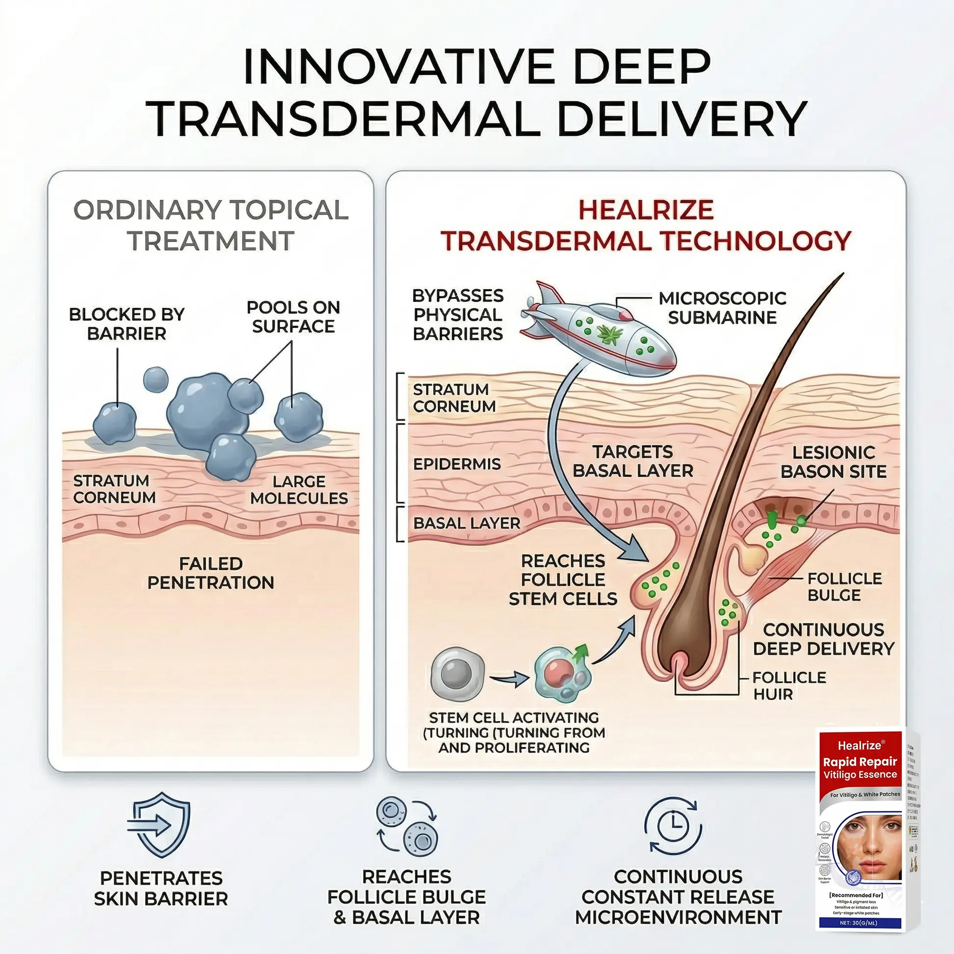 Past topical treatments often fail because their bulky molecular structures are completely blocked by the skin’s resilient stratum corneum, merely pooling uselessly on the surface. Healrize fundamentally transforms this with a revolutionary transdermal delivery mechanism.