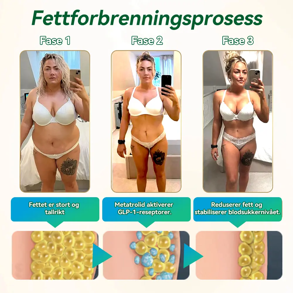 Meglutide, kombinert med eplecidereddik og det kraftige Moringa-ekstraktet, hjelper kroppen med å utnytte fettlagrene mer effektivt til energi. Ved å forbedre insulinfølsomheten akselererer det fettforbrenningen, spesielt under kalorirestriksjon eller økt fysisk aktivitet. Eplecidereddiken bidrar til å stabilisere blodsukkernivåene, og forhindrer at overskudd av glukose lagres som fett.