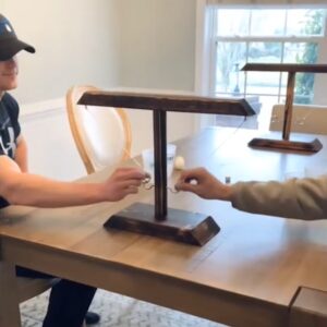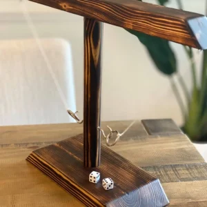 Place wooden shot glass in the center circle, touch rings and go! Each time you land the hook, move the shot glass 1 space towards your opponent. Player wins when the shot glass moves off the end of the ladder.