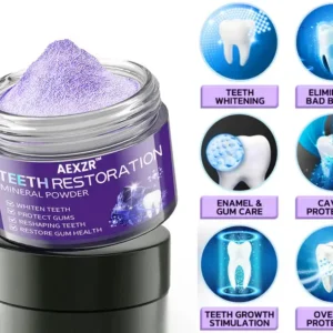AEXZR™ Teeth Restoration Mineral Powder eliminates 99.99% of bacteria, resolves bad breath, removes plaque and tartar, treats gingivitis and periodontitis, relieves toothache, prevents and treats cavities, restores tooth enamel, stimulates reparative dentin formation, and supports the regeneration of lost teeth.