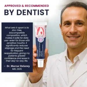 In clinical studies, AdhereDent® demonstrated a remarkable 98% denture retention rate over a 7-day period. The formula is completely zinc-free, non-toxic, and compatible with all common denture materials, making it safe for daily use, even for those with sensitive gums. Dentists across the country now recommend it to patients seeking a more reliable and comfortable alternative to conventional adhesives. Users also reported noticeably less gum soreness over time, thanks to the product’s gentle, cushioning properties.