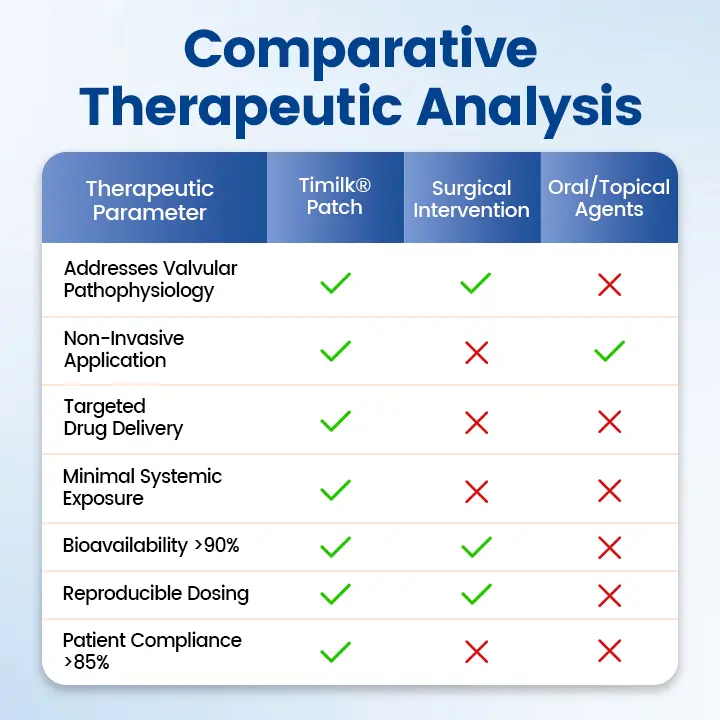 This targeted approach eliminates the primary failure modes of conventional treatments: inadequate bioavailability, non-specific distribution, and failure to address the underlying pathophysiology of valvular incompetence.