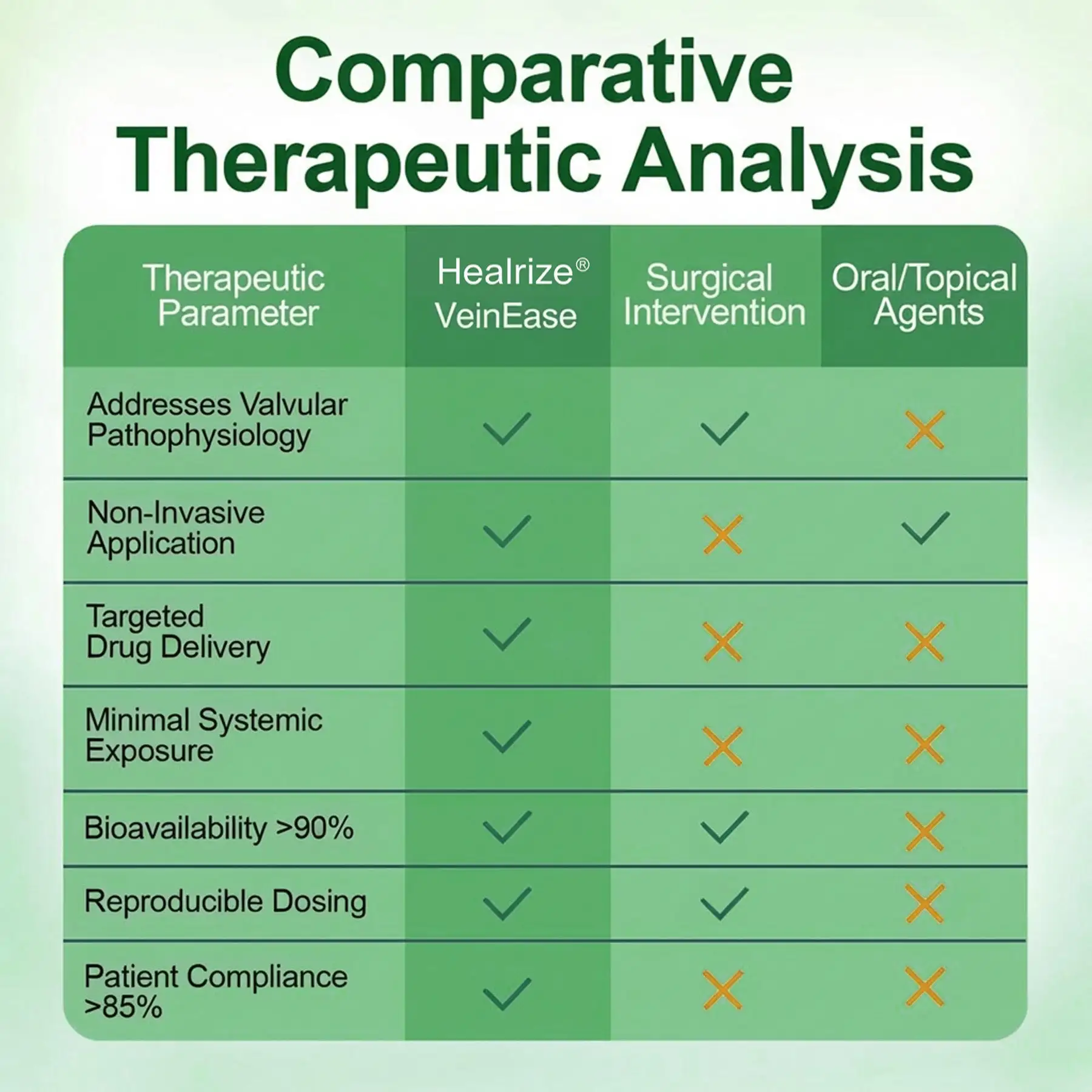 Healrize® VeinEase represents the first commercially available transdermal phytotherapy system specifically designed to address venous valvular insufficiency through localized botanical intervention. Unlike systemic treatments that dilute active compounds throughout the circulatory system or topical applications that cannot penetrate the dermal barrier, our microneedle delivery system ensures concentrated therapeutic compounds reach the target tissue with minimal systemic exposure.