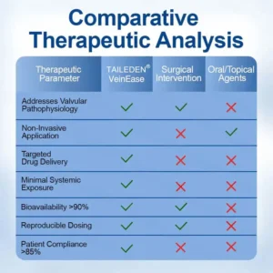 TAILEDEN® VeinEase represents the first commercially available transdermal phytotherapy system specifically designed to address venous valvular insufficiency through localized botanical intervention. Unlike systemic treatments that dilute active compounds throughout the circulatory system or topical applications that cannot penetrate the dermal barrier, our microneedle delivery system ensures concentrated therapeutic compounds reach the target tissue with minimal systemic exposure.