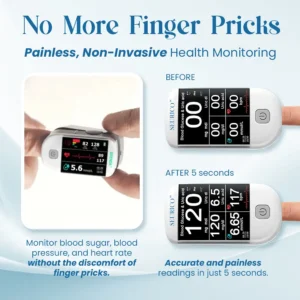 Take control of your health effortlessly with the Seurico™ Blood Glucose Meter. Forget about the discomfort of finger pricks! Now you can easily monitor your blood sugar levels, blood pressure, and heart rate—all in one, with zero pain.